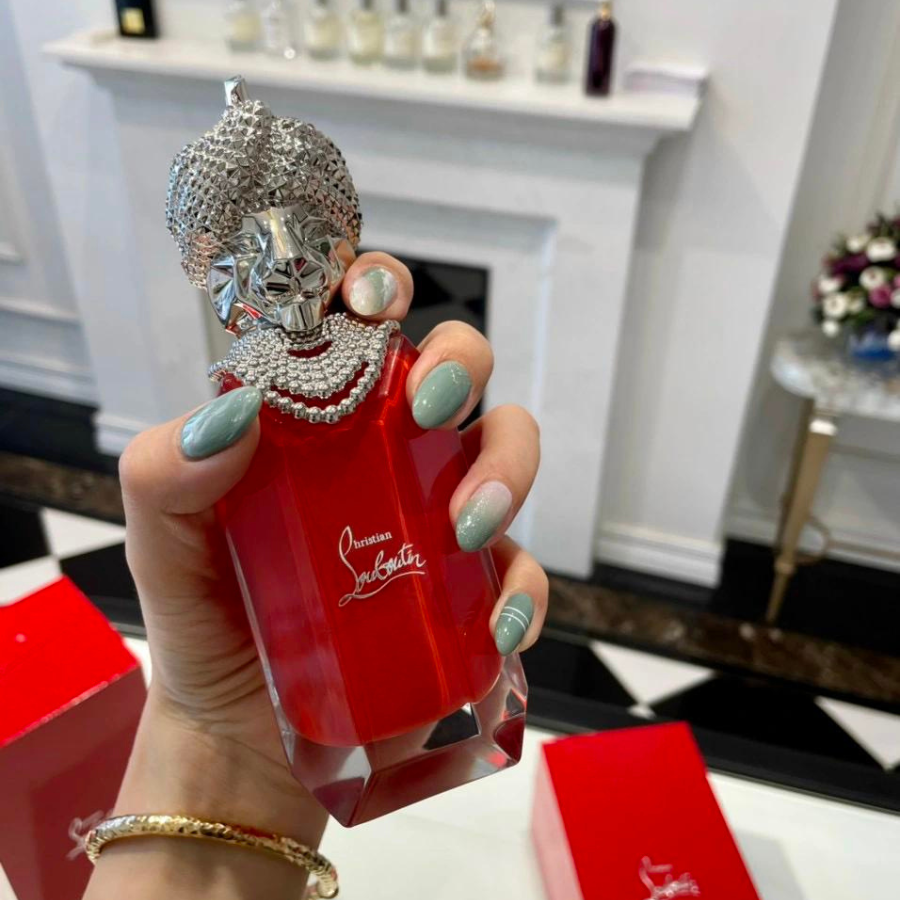+ Nước Hoa Nữ Christian Louboutin Loubiraj được đặt trong một chai nước hoa thủy tinh màu đỏ ruby có nắp được thiết kế đầu sư tử, với các điểm nhấn màu bạc và đỏ.