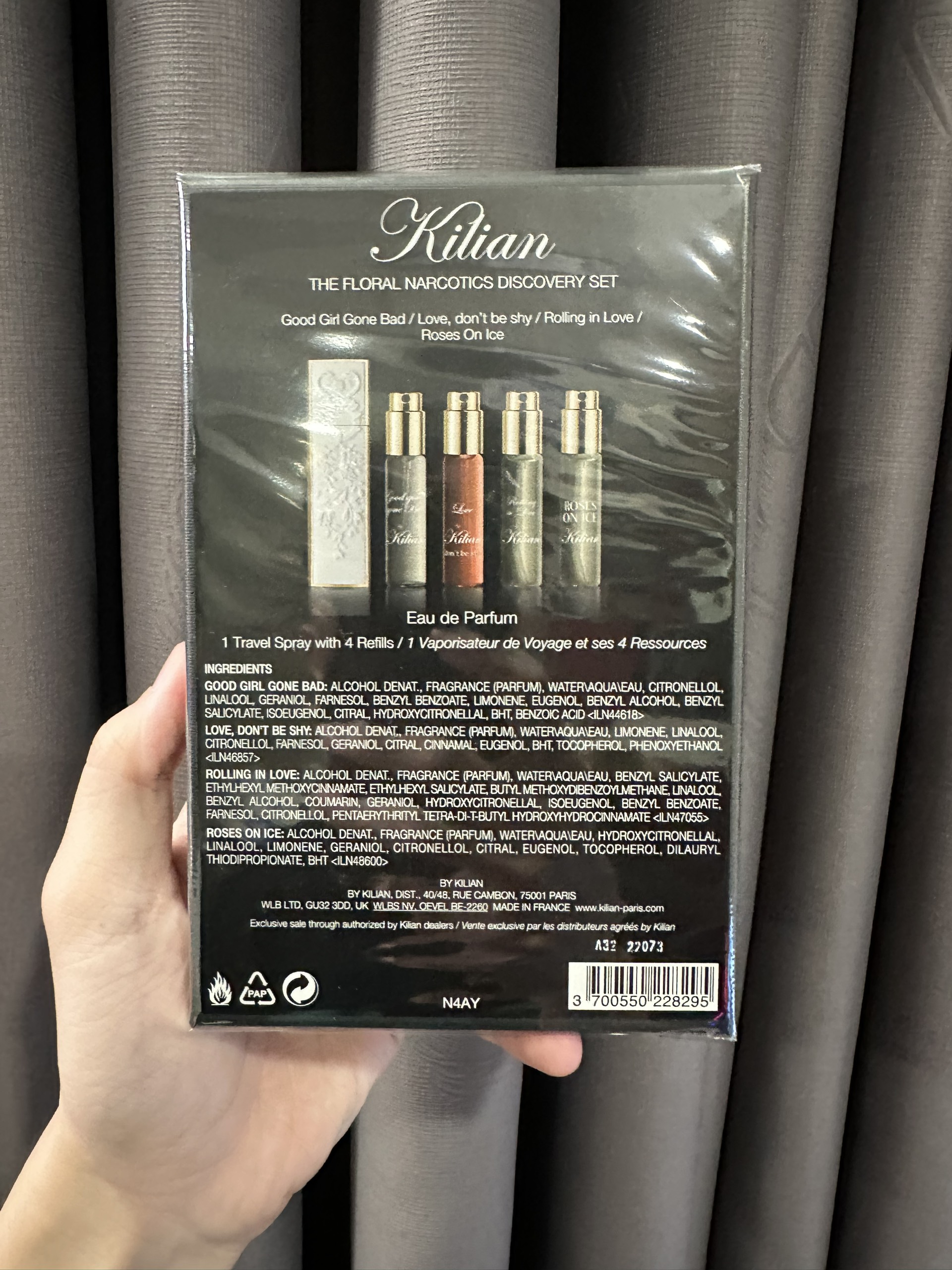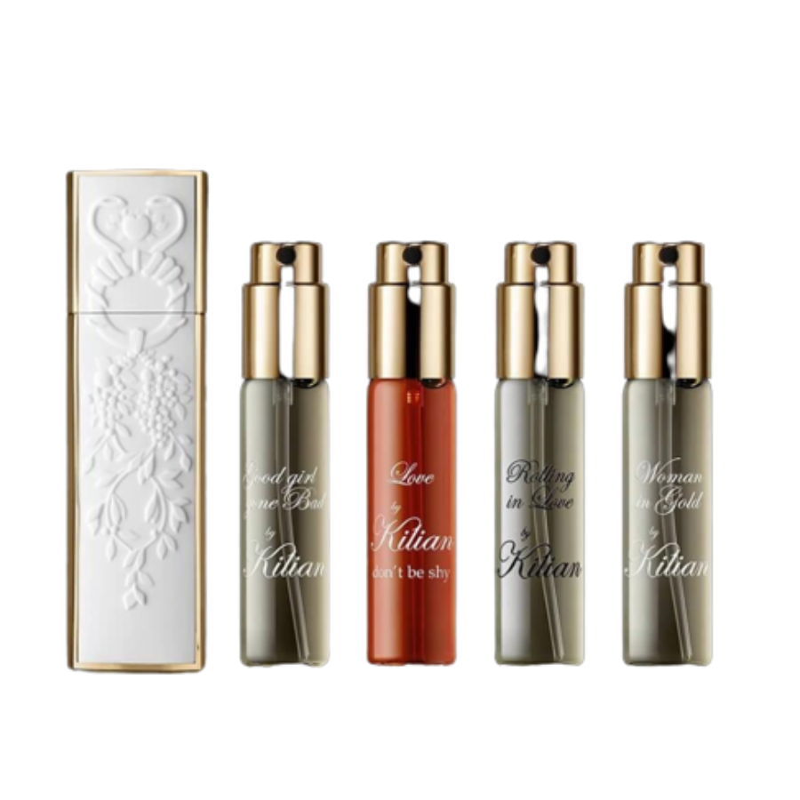 + Lần đầu tiên, bốn mùi hương mang tính biểu tượng của nhà nước hoa Pháp lừng danh góp mặt trong set gồm: 1 lọ trắng phối với kim loại vàng tuyệt đẹp, được trạm khắc tinh xảo, có thể sử dụng nhiều năm, 4 lọ nước hoa thủy tinh mà sau khi dùng hết dễ dàng chiết thêm nước hoa vào.